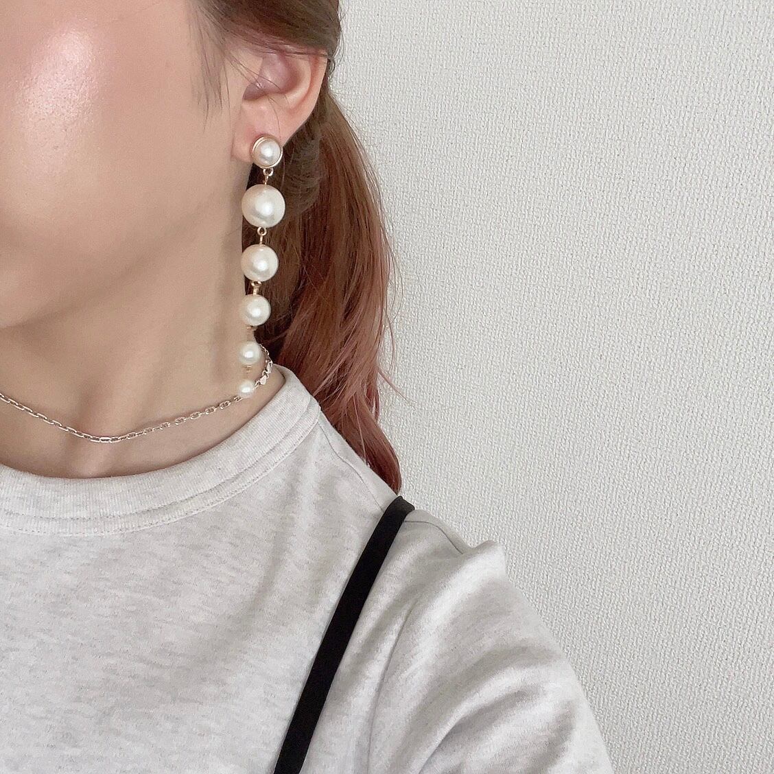 不揃いのパールが連なった存在感のあるロングパールピアス。